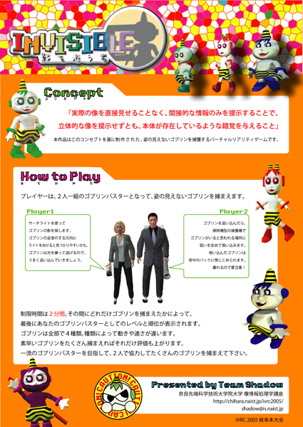 本作品のコンセプトは、 「実際の像を直接見せることなく、間接的な情報のみを提示することで、 立体的な像を提示せずとも、本体が存在しているような錯覚を与えること」 です。 このコンセプトに基づき、「姿の見えないゴブリンを捕まえる」という内容のゲームを製作しました。 |
