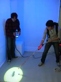 影の投影にはプロジェクタを利用しています。その際、実空間と同じ尺度の仮想3D空間を作成し、 センサーより得られた実空間の影投影用デバイスの三次元位置と傾きを、仮想3D空間上のカメラ に対応付けています。ここでは、仮想3D空間上の3D物体の色は黒、反射率は0とします。 カメラから見たこの物体の映像をスポットライトの形にマスキングすることにより、 サーチライトによって作られる3D物体の影の映像を作成します。そして、この映像を実空間の 影投影用デバイスのプロジェクタから投影することにより、サーチライトによって作られる 仮想3D物体の影として提示しています。 | |