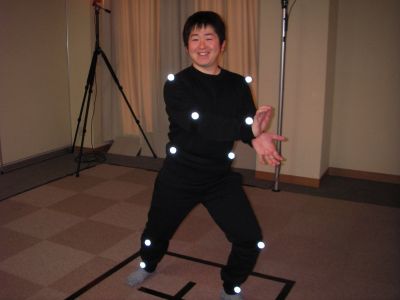 全身にマーカーを付け,特殊なカメラ(赤外カメラ)に囲まれたスタジオに,生徒たちは興味を示してくれたようでした. 実際に自分の動きを計測し,そのモーションデータに沿ってアニメーションさせたCGキャラクターを確認することで,モーションキャプチャーを経験として理解してくれたようでした.