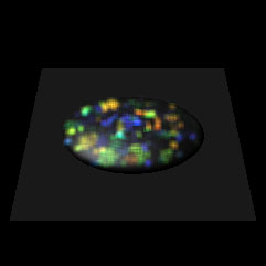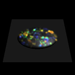 オパールの構造は,局所的(ミクロレベル)に捉えると規則的だが大域的(マクロレベル)に捉えると不規則であると言える.遊色現象の複雑な色彩はこのマクロレベルの不規則性に深く関係があるため,ミクロレベルでの光の回折現象だけを捉えてシミュレーションするだけでは不十分であり,マクロレベルでの不規則構造も考慮に入れる必要がある.本研究では,粒子をある程度の大きさでまとめてそれらを配置するモデルを提案する.このまとまりの中では粒子が完全に規則的に配置され,それらはすべて同じ反射特性を持つものとする.こうすることで,ミクロレベルでの粒子の規則的な配列による可視光領域の光の回折現象を考慮したシミュレーションが可能になり,また粒子のまとまりを,現実のオパールの構造を反映して配置することでマクロレベルでの不規則構造や空洞もモデルに導入することができる.