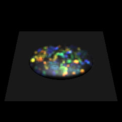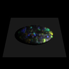 また、本研究で用いるオパールモデルはクラスタと空洞の集合体であり,光源からの光はすべてのクラスタに同じだけあたるわけではない.レンダリングに際して,観察者の視点位置からレイを飛ばしてそれを追跡して行く一般的なレイトレーシング法では光源からの光がどのクラスタにどの程度到達しているかが判らない.本研究では,予め光源からのレイトレーシングをすることで各クラスタに到達する光源からの光を計算しておき,その結果を用いて視線からレイトレーシングを行なうようにする.光源からの光線追跡では,マクロにおけるクラスタの配置情報と各クラスタにおける反射特性を参照してレイトレーシングを行い,各クラスタで反射した光の強度を得る.この処理によって得たクラスタ毎の反射光の強度と,クラスタ配置情報,視点情報をもとに視点からの視線追跡を行いオパールの分光分布を得る.この分光分布を等色関数によってRGB値に変換して画像を得る.