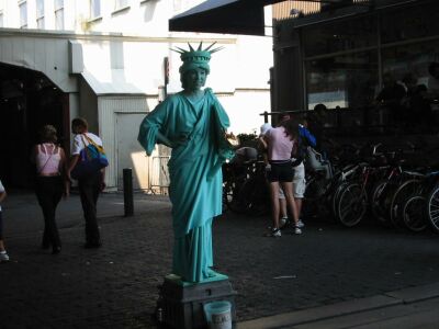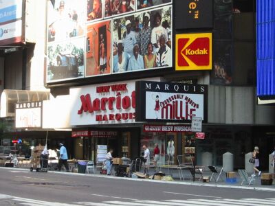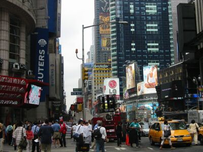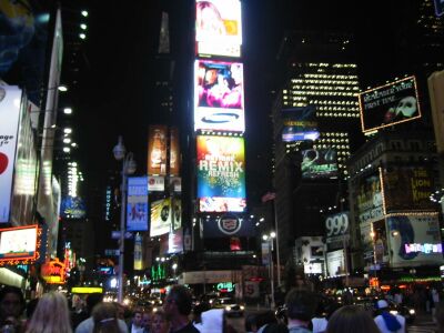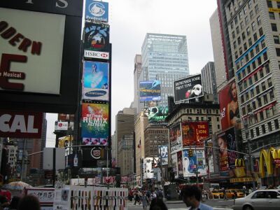 ソウルの仁川空港から14時間半、ニューヨークのJ・F・ケネディ空港に着いた。 ヨーロッパより短いフライト時間で行けるのかと思っていたが、同じぐらいの 時間かかった・・・いつものことだけど飛行機が一番疲れる・・。 空港からエアポートバスでグランドセントラル前で降り、電話してホテルを 探した。今回はちょっとお金を奮発してブロードウェイ沿いのホテルをとった。 グランドセントラルから地図を片手に歩いてブロードウェイを目指した。 それから北上し48丁目にあるホテルに着き、チェックインして市内を観光した。 この写真はタイムズスクエア。ここはニューイヤーのカウントダウンで有名な 場所だよね、テレビでよく見た場所に来てしまった・・と感動。 一番人通りが多く、観光客だらけにみえた。ミュージカルのチッケト 売り場ではたくさんの人が順番待ちをしてた。本には1時間待ちって書いてあった・・。