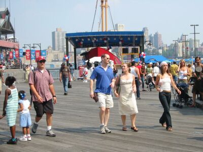 タイムズスクエアから南のほうを撮った写真です。 赤い服を着てる人はミュージカルのチケットを売っている人。
