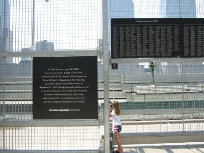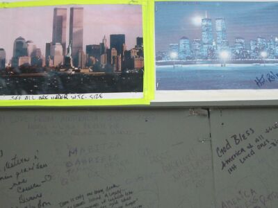 周辺の壁には、テロに屈しないという 多くの人のメッセージが書かれていた。 ワールド・トレード・センターの写真が はってあった。この写真を見ると 周りのビルのおよそ二倍の高さもあったんだなって。 こんな高層ビルが崩壊したなんて考えられない・・