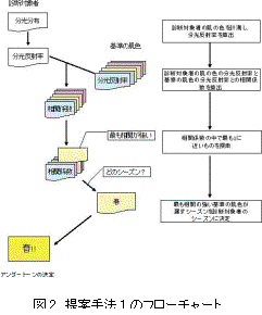 提案手法の手順を図2に示す。まず、診断対象者の肌の色を計測し、分光反射率を算出する。次に、算出した分光反射率と基準の肌色の分光反射率との相関係数をそれぞれ求め、最も正の相関が強い肌色を選び出す。最後に、この基準の肌色が属すシーズンを診断対象者のシーズンに決定する。基準の肌色として肌色パッチと各シーズンの平均値の2種類を用意した。