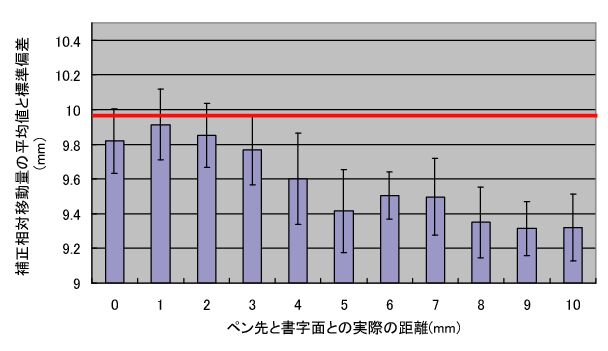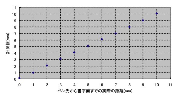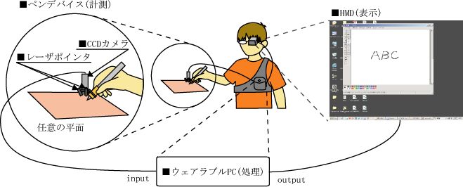 ■はじめに 世界には多くの遺跡があり, そこには様々な壁画が残されている. 有名なラスコーの 洞窟壁画は3万年以上前に描かれてたものである. このように, 人間は数万年前から 情報保存・情報伝達の一手段として道具を利用して``書く・描く"という行為を行ってきた. 手書きの大きな利点は文字・記号・図形等の統合的な情報を素早く 生成できる点である. 壁画から紙へと媒体を変え, 人類は多くの手書き情報を記してきた. 手書きが人類の文化・文明の発展に大きく寄与してきたことは言うまでもない. 近年のコンピュータの発明, 進化は情報生成に大きく影響を与えた. キーボードを利用して素早く文字・記号情報を生成し, マウス等の ポインティングデバイスとドローソフト等を利用して, 精細な図形を生成することが 可能になった. また, タブレットの開発によって手書き情報を直接デジタル化する ことが可能になり, CG作成を必要とするクリエイティブな分野等で普及している. そして近年, タブレットPCやPDA用のペンデバイス等のペンデバイスが開発され, 普及し始めている. これらのデバイスを用いることで, 実世界におけるノートや メモへの描画と同様な動作で手書き情報をデジタル生成することが可能になる. 現状では, これらのデバイスは情報の保存のみに特化しているが, 手書き情報が デジタル化されることは, 遠隔地間でのリアルタイムな情報共有も実現可能となる. 実世界での授業や会議のように, 手書き情報を利用して情報を伝達する環境を ネットワークを通じて広げることが可能になると考えられる. また, コンピュータの小型化や無線ネットワークの整備にともない, 「ウェアラブルコンピューティング」が実現しつつある. それらは, 身に付けたコンピュータによって「いつでも」「どこででも」 コンピュータを利用できる環境を作ることで, 日常生活において ユーザの行動を補佐・拡張することを目的としている. しかし, ``ウェアラブル"という環境である以上, マウスやキーボードを そのまま利用することはできない. 屋外での利用も可能な 入力インターフェースの開発が求められている. そこで「文字・記号・図形等の統合的な情報を片手で素早く生成できる」とい う手書きの利点を活かし, ウェアラブルコンピュータにペンデバイスを 導入することを考える. しかし, 既存のペンデバイスでは, 入力においてそれぞれ 固有の計測デバイス(タブレットの計測面, 赤外線による位置検出部等)を 必要とするため, モバイル性の高いデバイスではない. "ウェアラブル"という環境に適したペンデバイスの開発が求められている. これまでにもウェアラブルコンピュータで手書き情報を生成するシステムに関する研究が 行われている. 佐々木らは, "てのひらきゃんばす"において HMDに表示されたウィンドウ内で指先で描画を行うシステムを実現した. 椎尾らは, ジャイロと角度センサを内蔵したペンデバイスを用いて, 手首のひねりで描画を行うシステムを実現した. これら二つの共通点は, 書字面を必要とせず, 空中で描画を行う点である. 空中での描画動作は実世界のペンで描画する動作とは大きく異なり, 初心者には 難しく, 習熟に時間を要するという結果が出ている. また, ペンの支えとなる 書字面を利用しない空中での描画は, 従来のノートに書く文字のように精細な動作で 文字を書くことは非常に困難である. そのため, 人間が行ってきた手書きの動作に基づく ペンデバイスの開発が求められる. ■提案手法 ペンデバイスに求められる機能として