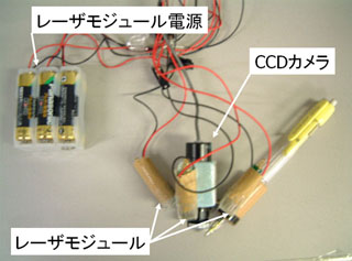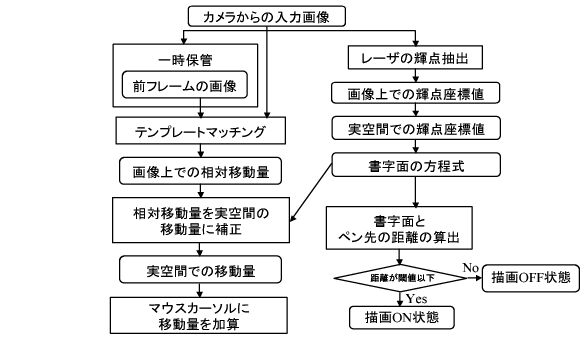 ![]() 図1:提案システム ![]() 図2:処理の流れ 提案システムでは, カメラは書字面の上方から書字面を鉛直下向きに 撮像する. カメラから得られる映像の各フレームに対し, テンプレートマッチングを 行うことで, 画像内での相対的な移動量を検出する. また, 得られる画像と書字面が透視投影の関係にあると仮定すると, カメラの高さに応じて映される書字面の領域が変化するため, 高さ毎に相対移動量も 変化してしまう. 複数のレーザーポインタが書字面に生成する輝点の位置を カメラから取得し, ペンデバイスと書字面との位置関係を取得する. 計測された情報に基づいて, 相対移動量の補正を行ない、実空間での移動量を 求める. 得られた移動量をマウスカーソルに与え, またペンの高さから描画の ON-OFFの状態を判断し、ペイントソフト等で描画を行なう. ■試作ペンデバイス 試作したペンデバイスを図3に示す。 ![]() 図3:試作システム ![]() 図4:試作ペンデバイス ■実験 実験として"ペン先位置検出精度の評価"と"補正相対移動量取得精度の評価"を行った。 (1)ペン先位置検出精度 鉛直方向にスライドする台にペンデバイスを固定し、ペン先高さを0〜10mmまで1mm刻みで上げる。各高さでの書字面からペン先までの実際の距離と計測値の比較を行った。また、10度程度の角度を与えた際の面からペン先までの実際の距離と計測値の比較も行った。 ○実験結果 実験結果を図5、6に示す。 ![]() 図5:ペン先から書字面までの距離(傾きなし) ![]() 図6:ペン先から書字面までの距離(傾きあり) ○考察 傾きがある状態でも誤差0.1mm程度でペン先位置が取得できている。レーザポインタの輝点による書字面の方程式の算出が有効であることが確認できる。 (2)補正相対移動量検出精度 垂直方向にスライドする台にペンデバイスを固定し、ペン先高さを0〜10mmまで1mm刻みで上げる。垂直方向に10mm移動させたときの補正相対移動量の計測値を取得する。描く高さで10回試行し、計測値の平均値と標準偏差を算出した。また、10度程度の角度を与えた際の各高さでの補正相対移動量の平均値と標準偏差も算出し、実移動量との比較を行った。書字面として図7のようなドットパターンを用いた。 ![]() 図7:補正相対移動量(傾きなし) ○実験結果 実験結果を図8、9に示す。 ![]() 図8:補正相対移動量(傾きなし) ![]() 図9:補正相対移動量(傾きあり) ○考察 ペン先の高さが上がることによる補正相対移動量の減少が生じている。これは、画像上の相対移動量は離散値であるため、補正相対移動量には量子化誤差が生じるためである。高さが上がることで1画素に投影される領域が広くなるため誤差が大きくなっていると考えられる。 ■まとめ ウェアラブル環境で利用するペンデバイスとしてカメラとレーザポインタで構成されるペンデバイスを提案した。ペン先位置検出、相対移動量補正の実験を行い、細かな範囲でのペン先移動量取得が有効であることを確認した。しかし、現システムではペンの角度変化によって画像内での移動量を取得してしまう。ペンの角度変化を考慮したアルゴリズムの検討を今後の課題とする。 |