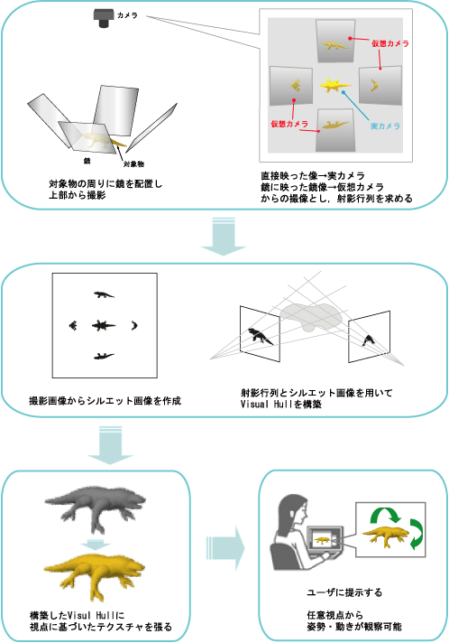 複数枚の鏡を使って、多視点画像を同時に撮影します。