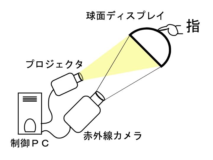 システムは,球面ディスプレイ、赤外線カメラ、制御PC、プロジェクタから構成され,
