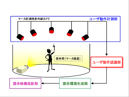 ユーザ動作計測部では,操作者の頭,腕,手など身体各部に貼付されたマーカ