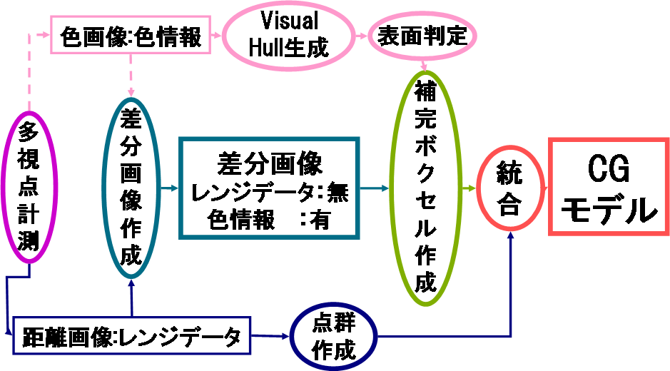 「距離情報と色情報を相補的に用いた3次元CG生成」