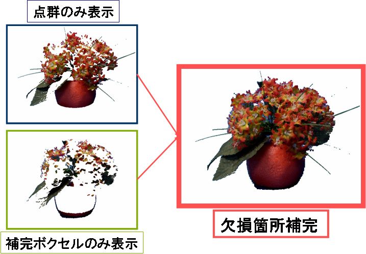 距離情報の欠損箇所に色情報から再構成したボクセルを用いて