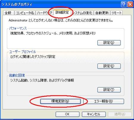 「マイコンピュータ」アイコンを右クリック→「プロパティ」→