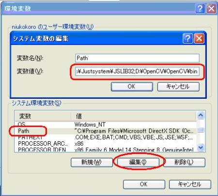 「;D:\Open\OpenCV\bin」を追加(先頭のセミコロンを忘れないこと)します.