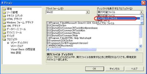 (1)「ツール(T)」→「オプション(O)」→「プロジェクト」→「VC++ディレクトリ」を選択します.