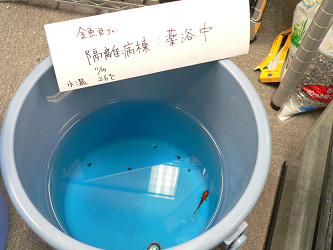 そのうち、より弱っていた小さいほうの2匹を、大きいほうの2匹と隔離して、水温を上げて薬浴中。。