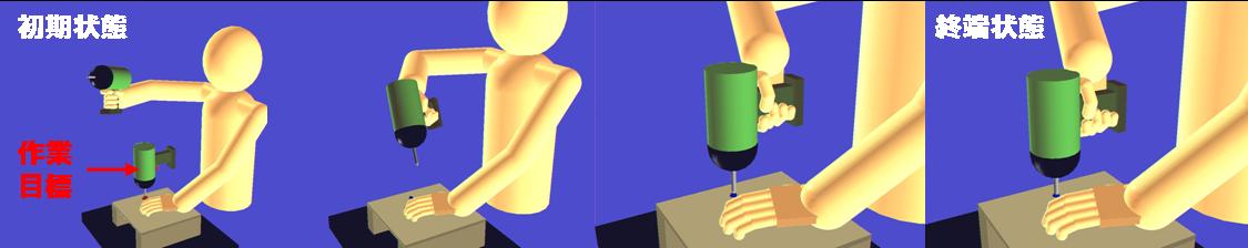 近年,多くの工場において生産方式が多品種少量生産へと移り変わっている. 多品種少量生産では,品種の数に対応して作業工程や作成するマニュアルが増加 するため,製品やマニュアルの作成負担を軽減することが望まれている.マニュ アルとしてCG による作業動作を提示することで,作業者は作業の様子を様々な 位置視点から見ることができ,作業の詳細を知ることができる.そこで,本研究 では,CG マニュアルに用いる道具を扱うといった作業の動作を簡単な入力で生 成することを目的とする.動作の生成には,入力作業が少なく,計測データを必 要としない逆運動学による手法が向いていると考えられる.しかし,逆運動学に よる手法では,手のように自由度の高い部位の動作生成は容易ではないため,道 具の扱い方に注目した動きの制約を加えた作業中の手法を提案する.提案手法を 用いて作業を行う動作の生成を行うことで,提案手法の実現性を確認し,動作の 作成に必要とする時間を一般の動作生成ツールと比較することで,動作作成の簡 便さを検証する.