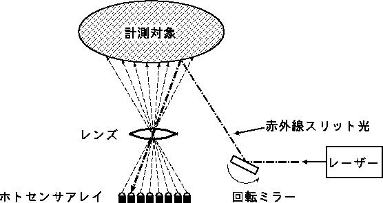原理図シリコンチップ上には、24x24画素のホトセンサアレイが構成されている。 各ホトセンサは1画素ごとに視線方向を固定し、その視線と対象物体が交叉する点に着目している。 赤外線のスリット光は、一定速度で回転するミラーによって計測物体を走査する。 これにより、投影角は走査開始時からホトセンサが受光するまでの時間に起き替えることができる。 この投影時刻のデータがコンピュータに入力され、距離画像の算出に使われる。