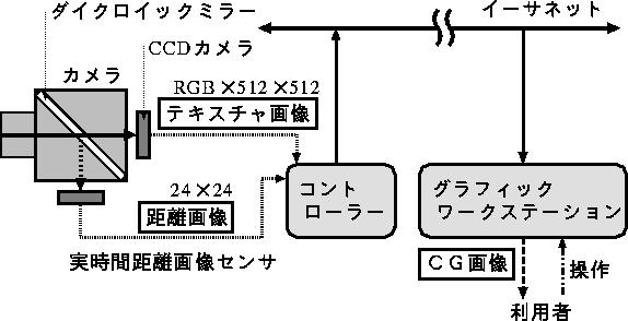 距離画像ならびにカラー画像を得るためのレンジファインダ、レンジファインダを制御し得られた画像を処理、伝送するためのコントローラ、画像を合成するグラフィックワークステーションからなる。