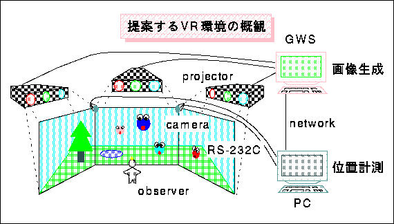 本システムでは,入力サブシステムが被験者の頭部位置情報を獲得する頭 部位置計測サブシステムとなり,出力サブシステムが被験者に視覚情報の提示 を行う画像提示サブシステムとなる.制御サブシステムは入力情報によって仮 想世界を構築し,提示画像を生成する.システム概要をここに示す.