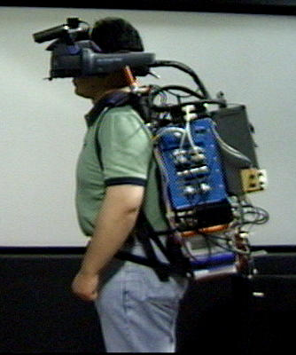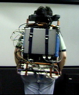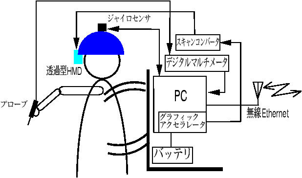 試作したシステムは図 2 に示すような、PCをベースとした背負 型の自立装置である。図 3 に示すように、搭載するPCに は、仮想環境映像生成のための3次元グラフィックアクセラレータを搭載し、CGの立体 視が可能である。ホストシステムとの情報交換を行なうために無線Ethenetを搭載し、 TCP/IPプロトコルを用いた情報通信が可能である。装置に作業者の位置と姿勢の情報を 取得するため頭部に小型3軸ジャイロセンサを設置している。仮想環境のディスプレイ 装置として透過型HMDを採用した。これらの装置はすべて同一のバッテリ用いて約2時間 駆動することが可能である。装置のマウントに登山用フレームを用いたことにより、こ の装置をAR-Backpackerと呼んでいる。