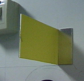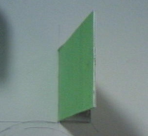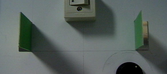 図6に、作業ホットスポットに取り付けられた提案する治具 を示す。この治具は各面を異なる色を有する平面板であり、作業者は平面板と同じ平面 上に自身の視点が位置するように、平面板の色と見かけの面積を見ながら頭部の位置を 補正する。この治具を左右2箇所でそれぞれ内向きに設置することで、床上の頭部位置 を空間中に固定することができる。地上高は作業者の身長データから得ることで、座標 を固定できる。作業者は、できるだけ頭部位置を動かさないようにしつつ作業に入る。 作業者の頭部姿勢変化による仮想環境の位置ずれに対しては、HMD上部に設置された小 型3軸ジャイロセンサのデータより補正する。