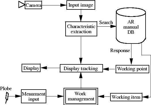 The flow of this system is shown in Figure 3. Like this figure, the work procedure is accumulated to the database inside PC. The types of the object estimated on the characteristic point arrangement of the work target that was acquired from cameras and the information of the work item and work place for each types are drawn dynamically from database. Beside the prompting markers are superimposed on the target board in accordance with the camera tracking information of the characteristic point, the graphical instructions are given by the worker. The electric data gathered from measuring devices is inspected automatically and simultaneously. When the condition is filled, the instruction goes next.