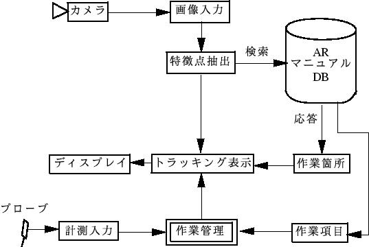 本システムの処理の流れを図3に示す。この図のように、作業手順 はPC内のデータベースに蓄積されている。カメラから取得された作業対象の特徴点配置 に基づき対象の種別が同定され、種別毎の作業項目と作業箇所の情報がデータベースよ り動的に引き出される。特徴点のトラッキング情報に従い、対象上の作業箇所上に強調 マーカがスーパーインポーズされるとともに、グラフィカルな作業指示が作業者に与え られる。この時、計測器からのデータは作業項目の目標値と比較され、条件が満たされ れば次の作業項目に自動的に移る。