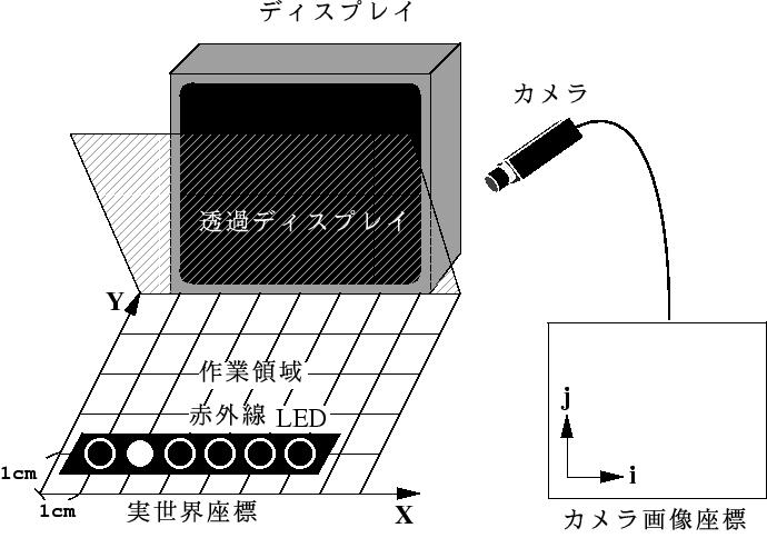 キャリブレーションを行なうため、PCのパラレルポートに接続されたデジタルI/Oを用い て既知の座標に設置された赤外線LEDを点滅させる。赤外線LEDは、薄い棒 状の治具の上に1cm間隔で1列に配置し、図4に示すように作業領域 内に設置する。赤外線LEDを順々に発光させつつ、本治具を1cm間隔で移動させ、作業領 域内すべての格子点の撮影を行う。
