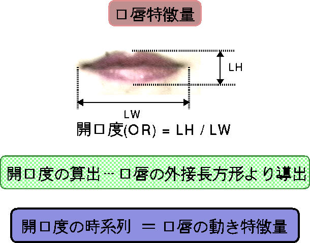 発話の際の口唇の動きをパラメータで表現し、発話パターン全てをこのパラメー タで表現した時系列データを口唇の動き特徴量と定義する。 なお、口唇のパラメータは開口度により表現した。
