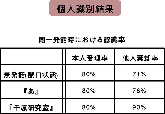 上記の手法を用いて、個人識別実験を行った。その結果、異なる発話においては、 他人棄却率100%としたとき、他人棄却率95%と高い認識率が得られた。また、同一 発話時における個人識別実験結果より、発話パターンの長 い『千原研究室』においては高い個人識別率が得られた。