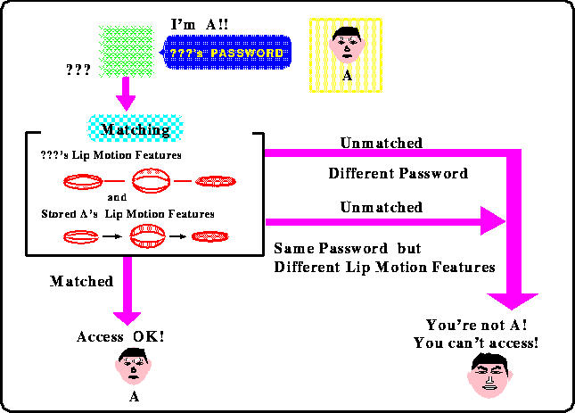 The testee is asked to make a specific utterance, and the image sequence containing the mouth motion is taken by a video camera. Lip motion is represented by the ratio (width vesus height of mouth) for each frame of the image sequence. The sequence of the opening ratio of the mouth is defined as "lip motion features".