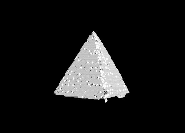 前段階で得られた三次元モデルは点表現で表されたものである。点表現ではデータ数が膨大で不規則に並んでいる。これではCG表示に不適切なので、データ数を削減しデータを当間隔に並び変えるためにボクセル表現に変換する。ここで、もともとそのボクセルに点群データがいくつ入っていたかを形状(そのボクセル)の信頼度とする。