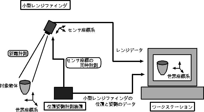 先ず、小型レンジファインダで対象物体を任意の視点から部分的に走査し計測する。それによって、小型レンジファインダから対象物体の断片的なレンジデータが、位置姿勢計測装置から対象物体に固定された座標系における小型レンジファインダの三次元座標とその姿勢のデータが得られる。この部分的走査を繰り返し、対象物体全表面のデータを取り込む。次に位置姿勢計測装置からのデータ(変換パラメータ)よりレンジデータを対象物体に固定された座標系の座標値に変換する。最後に座標変換された断片的なレンジデータを統合して対象物体の点表現で表された三次元点群モデルを得る。
