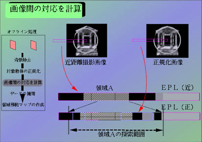 この時、近距離撮影画像と正規化画像は類似の情報を持っていると考え、近距離撮影画像からのみの対応を取る。近距離撮影画像を基準に置いたのは、テクスチャ、形状情報を多く含むと考えたからである。