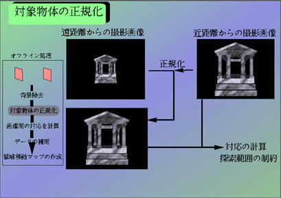 処理の流れとしては、先ず撮影された近距離撮影画像、遠距離撮影画像から背景を除去します。次に、対象物体の大きさを正規化し、領域ごとの対応を取ってデータを獲得。さらに、抽出できなかったデータを補完した後に領域移動マップを作成する。