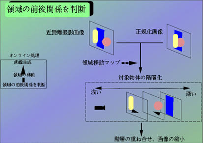 解析処理によって得られたデータをもとに、VR環境内に実時間で 中間画像を生成し、表示させることを目指す この時、領域を移動させたに領域が重なることがあり、領域の優先問題が発生する。 しかし、すでに対応領域が判明しているので、簡単な計算により視点からの 相対深度を得ることができる。 得られた深度を基に画像を階層化する。階層化された領域を領域移動マップに従って 移動させ、再び重ね合せることにより領域の前後関係は保存される。