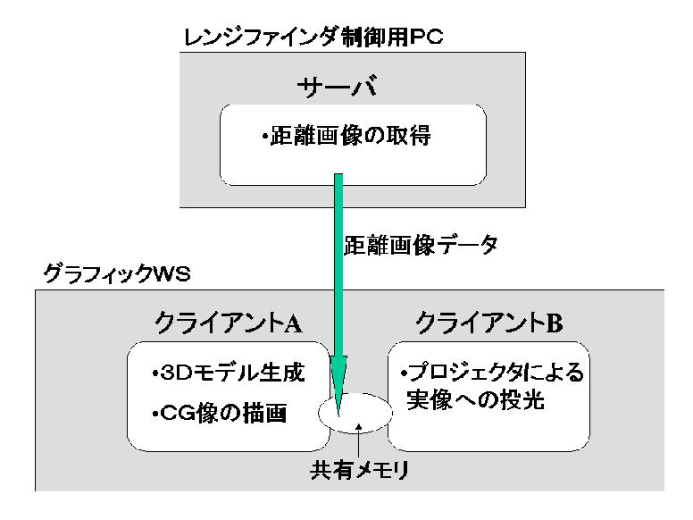 クライアント側のプロセスは二つあり,一つはCG像をCRTで映像にするプロ セスでありクライアントAとする. もう一つは実像に投光するためのプロジェクタに映像を出すプロセスでありクライ アントBとする.サーバで作成した距離画像データはクライ アントAにイーサネットを介して送信される.クライアントBもサー バからの距離画像データを利用するが,直接サーバからデータを受信しないで クライアントAとの共有メモリでデータを取得する.