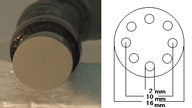 The probe used for measurement is the ring array probe of a diameter 16mm. 8 transducers which diameter is 2mm are arranged on the circle of 10mm. (Fig.1) One of the transducers transmitted a spherical pulsed wave and the other 7 ones received the echo