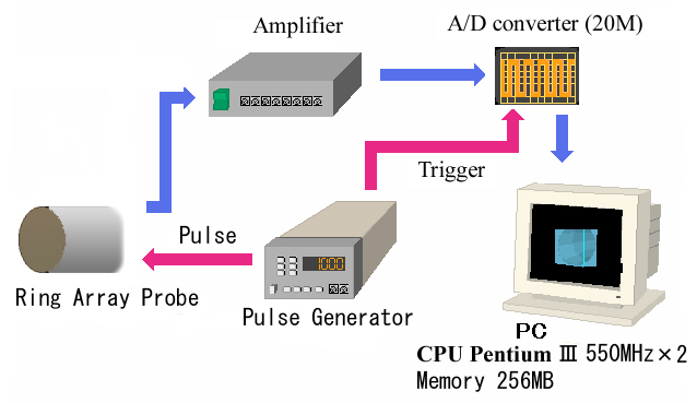 Figure 2 shows the experimental system consisting of the 2-D ring array probe, a pulse generator (Hewlett Packard 8116A), an amplifier, an A/D converter (Circuit Specialists PCI9812), and a personal computer (Dual pentium3 Xeon 550MHz). The system works as follows.