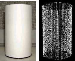 計測対象として図9の左に示す,表面に白い紙をまいた円筒形物体を用いた.大きさは,直径77mm,高さ142mmである.360度周囲で300回走査を行った結果を点群表示したものを図9の右に示す.そして点群と計測対象の中心軸の位置合わせを行った後,直径の標準誤差を計算した結果は1.206mmであった.