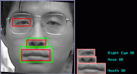 入力顔画像から顔を抽出,大きさと傾きを正規化し,照明変動の影響を受けにくい照合手法で目・鼻・口部分を照合