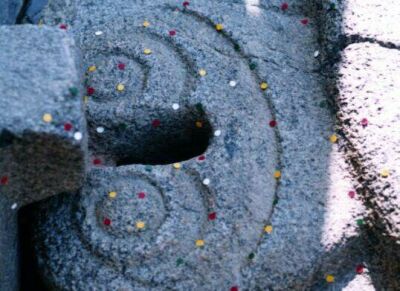 First, markers are put on Kamegata-Ishi. The diameter of the marker is about 2cm. The corners and edges of the object are marked selectively and on the plain surface markers are distributed randomly. The color of the markers are selected in the way that the color of one marker is differs from the color of any neighbour marker. This way of assignment of color is convenient for abstraction of markers when automatic stereo matching. The markers are used for