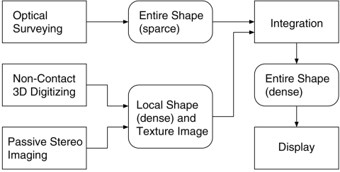 To preserve historical relics the color and the shape of the object are indispensable. (Spectrum, material, weight are also need in some case.) In case of this research, the authors adopted the heterogeneous methods, which measure the object using a total station, non-contact 3-D digitizer and stereo photographs. The procedure is shown as Figure 2.